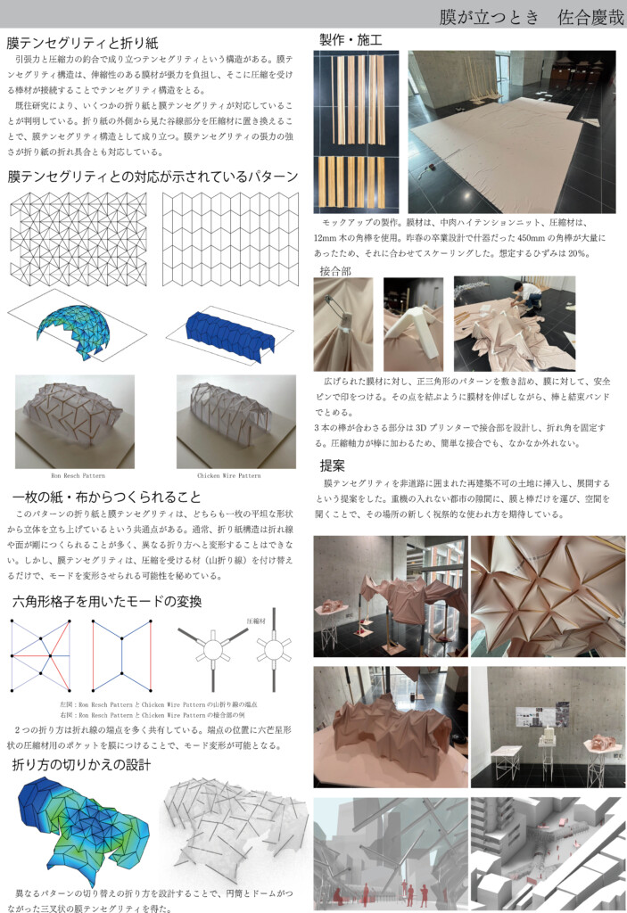 例年の課題内容との大きな違いは< 現実世界-バーチャル空間>に関する言及である。これまで2回のスタジオ課題では、構造計算やGrasshopper上でのシミュレーションを行い、スケールの小さな模型は制作していたものの、実スケールでの検討はなされてこなかった。そのため、施工や製材、接合部、材料といった現実的な要素が欠如した提案が多く、バーチャル空間上にとどまった提案が多かった。しかし今年度は、スタジオ受講者3名それぞれが、実スケールもしくはそれに近いスケールでのモックアップを製作し、バーチャル空間から現実世界へと踏み出す提案を行った。この実践によって、バーチャル空間と現実世界のあいだにあるギャップを自らの手で埋める試みがなされ、より説得力のある提案となったと言えるだろう。