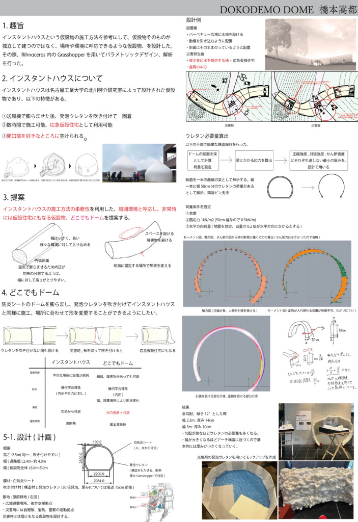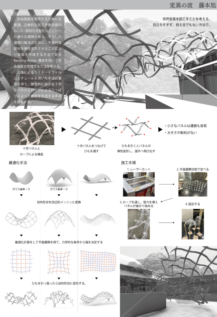 近年の計算機の性能や施工・製作技術の急速な発展にともない、多様な建築形態がデザインされるようになった。意匠のみならず、構造・環境・施工などの種々の設計条件を満足し、それらを高度に統合するためには、デザインとエンジニアリングを横断できる設計者の存在がますます重要となるだろう。 本スタジオでは、解析ツールやプログラミング、デジタルファブリケーションを設計過程で積極的に用いて、 コンピュータによる形態創生・解析技術が拓く革新的なデザインを探求する。プログラム・敷地等に制限は設けない。構造系教員が有する構造解析・形態創生のノウハウを吸収しながら、< 現実世界-バーチャル空間>、< 人間の直感-コンピュータによる自動化 > が調和した新時代の建築設計プロセスを組み立てる。 構造力学やプログラミングの知識を適宜吸収しながら課題に取り組むものとする。