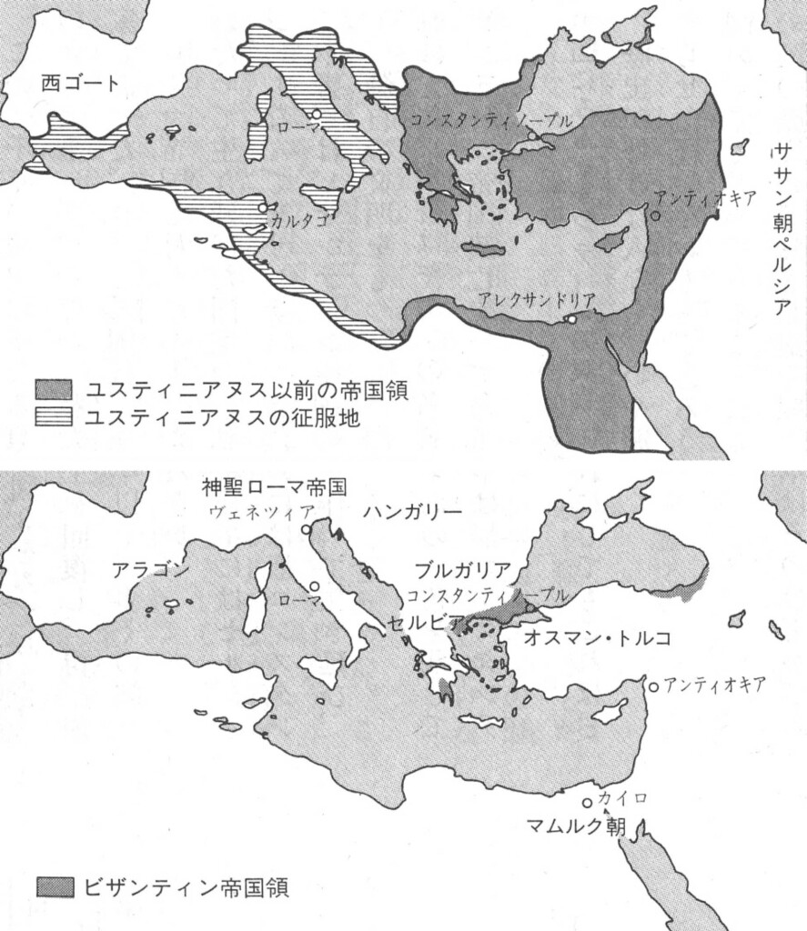 図1 ビザンティン帝国領 565年(上) 14世紀半ば(下)(井上 浩一:生き残った帝国ビザンティン, 講談社現代新書, 1990)