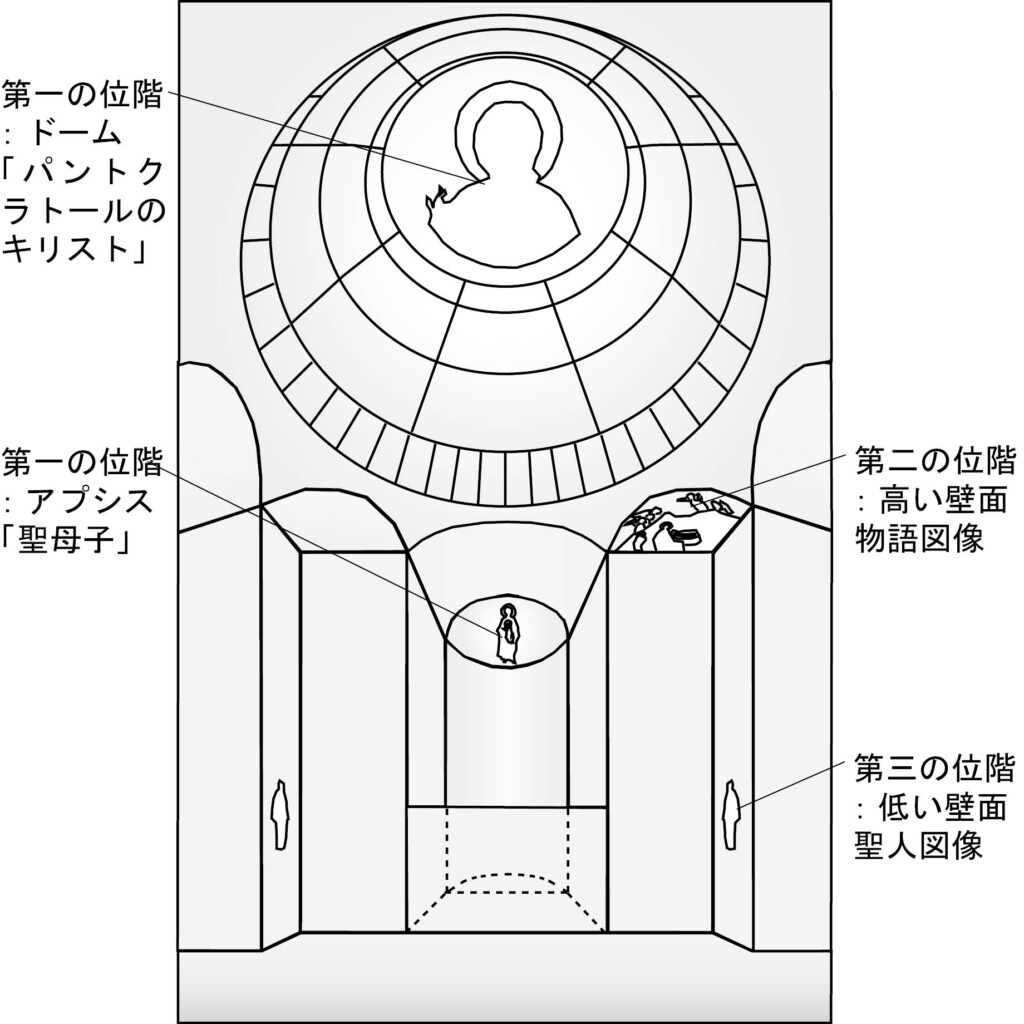 20世紀半ばのオットー・デムスによる研究で、ビザンティン聖堂のモザイクによる装飾の大枠として、キリスト教絵画における垂直方向の位階制、すなわち「三段階理論」(図4)が議論された。「三段階理論」において、内接十字式のビザンティン聖堂のモザイク装飾には三つの位階的構造があるとされる[3]。第一の位階はドームとアプシスである。ドームに「パントクラトール(万物の統治者)のキリスト」が描かれ「神としてのキリスト」を示す。アプシスには「聖母子」が描かれ「人としてのキリスト」を示す。第二の位階は聖堂内の比較的高い壁面で、キリストの物語などの説話的な図像が描かれる。キリスト伝図像は、文字を読むことのできない信者に対して、キリストの生涯を視覚的に表現し、キリスト教の教義をわかりやすく示す機能をもつ。第三の位階は人間と同じ高さにある低い壁面で、聖人図像が描かれる。聖人図像は、信者の祈りを直接に受けとめ神に伝達し、神と信者をつなぐ役割を果たす[4]。