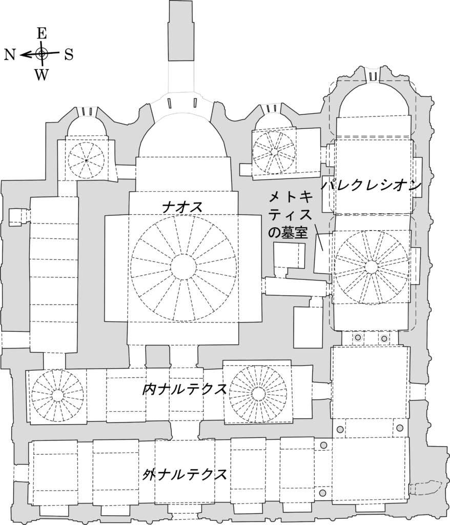 図6 コーラ修道院聖堂平面図(R. Ousterhout : The architecture of the Kariye Camii in Istanbul, Dumbarton Oaks Research Library and Collection, 1987に加筆)