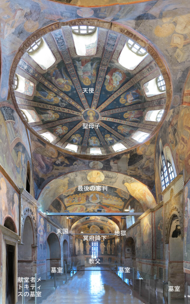 コーラ修道院聖堂パレクレシオンでは、献堂者の墓室のある葬礼用礼拝堂として聖母マリアの「予型」「最後の審判」「復活」が壁画の主題として選択され、ドームで「聖母マリアによる執り成し」が、ヴォールトで「審判」が、アプシスで「キリストによる救済」がそれぞれ表現されている(図7、8)。これは、先に述べたように本来は神の世界であるドームに座すべきキリストが、地上の世界にある墓室へと手の届く高さまで下りてきたとも解釈できる。14世紀の増改築、その際に製作されたモザイク、フレスコによって複雑化した建築空間において複数の壁画による意味連関が生じ、これにより建築だけでは表現することのできない神聖な宗教的空間が実現している。増改築によって生じた非整形で複雑な建築空間と、相互に繋がりを持つ壁画によって構成される意味空間が重なって、それらが互いに関係し合うことにより、3次元のビザンティンの宗教的空間をより豊かなものにしているのである[5]。ビザンティンの人々が神聖な宗教的空間において表現しようとしたものの意味、コーラ修道院聖堂でいえば聖母マリアを介してキリストに捧げられた「祈り」、それはビザンティン聖堂の「建築と壁画」に込められた最も重要なものの一つなのであろう。