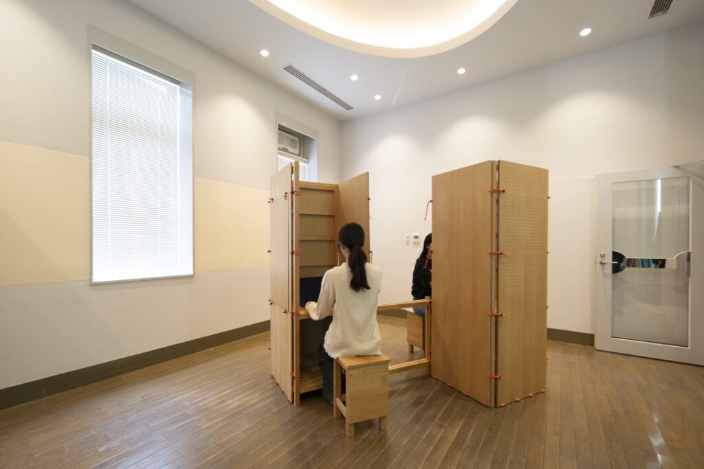 吉田キャンパスに新設されるDIINセンター(ディスアビリティ・インクルージョンセンター)内の活動スペース「DIINスタジオ」のための什器の設計。施設を主宰する村田淳先生と打合せを重ね、実際の製作を行う喜木家具工房の南山喜揮さんの助言も得ながらプロジェクトは進められた。障がいのある学生のための支援器具のフィッティング(試着、調整)や、センタースタッフらのミーティングなど、異なる場面に合わせて部屋が可変できるような什器の製作が求められた。