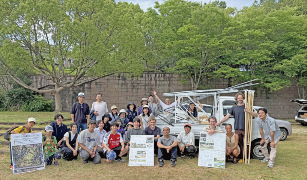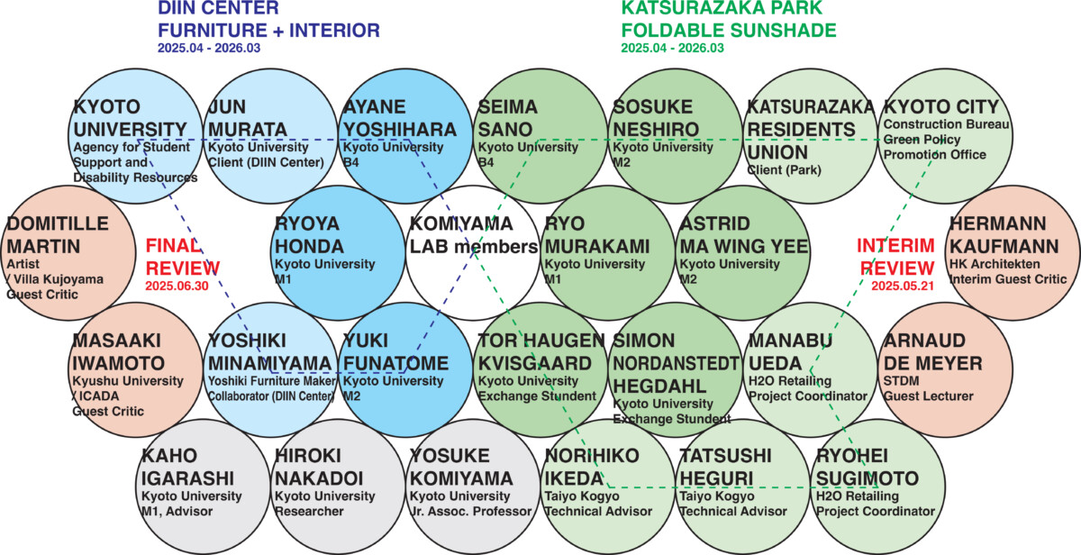 桂坂公園の活性化を、京都市建設局みどり政策推進室、桂坂自治連合会、エイチ・ツー・オー リテイリングと一緒に、考えていくプロジェクト。技術協力と材料提供の面では太陽工業にもご協力いただき、まずは、2025年の7月に折り畳みができる日除けの仮設構造物を公園に実装することを目的にプロジェクトがスタートした。