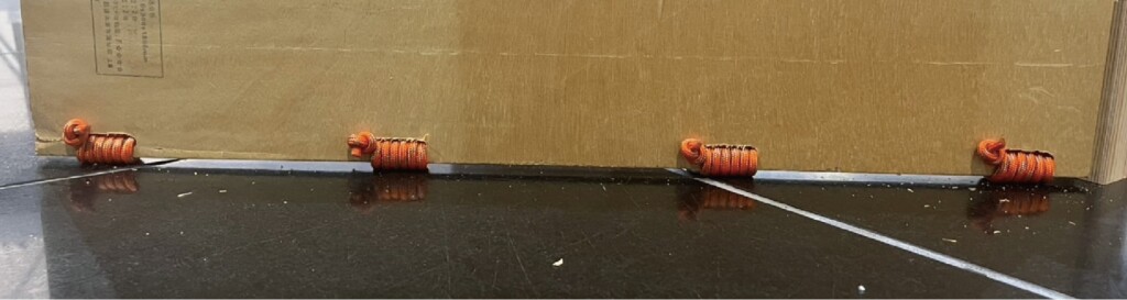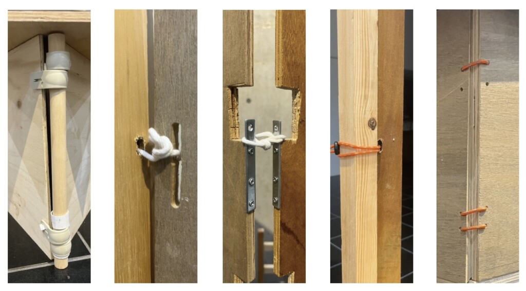 接合部にはパラコードと呼ばれる紐を用いた。登山でも使われる強度のある紐で、コードロックと組み合わせればロープワークに詳しくない人でも取り外しが容易で、屏風を外して机の天板にしたり、屏風と島との接合位置を簡単に変えることができる。紐を緩めることである程度の誤差も許容して固定できるため、想定外の組み合わせ方も可能になる。紐と板との接合方法を様々検討した結果、最小限の穴を開けて紐を通すシンプルな方法に収斂した。