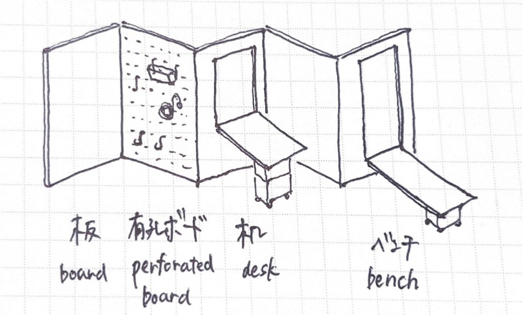 屏風と同じ折り畳みの機構を用いた椅子と、屏風を固定するための「島」と名付けた家具も設計した。椅子の形状はシンプルな六面体(立方体)とし、単体で座れるほか、積み上げれば机の脚や棚としても使える自由度を持たせた。中は空洞で、底にはキャスター付きでスムーズに動かせるため、来客のちょっとした荷物を収納したり、イベント時には台車代わりに荷物を運ぶ道具にもなることを意図している。島は、屏風を安定させる支えになるほか、異なる高さに設けられた水平の棒材が支援器具をクランプやクリップで固定するための拠り所となる。後述のパラコードと組み合わせることでさらに様々な使い方が考えられる。