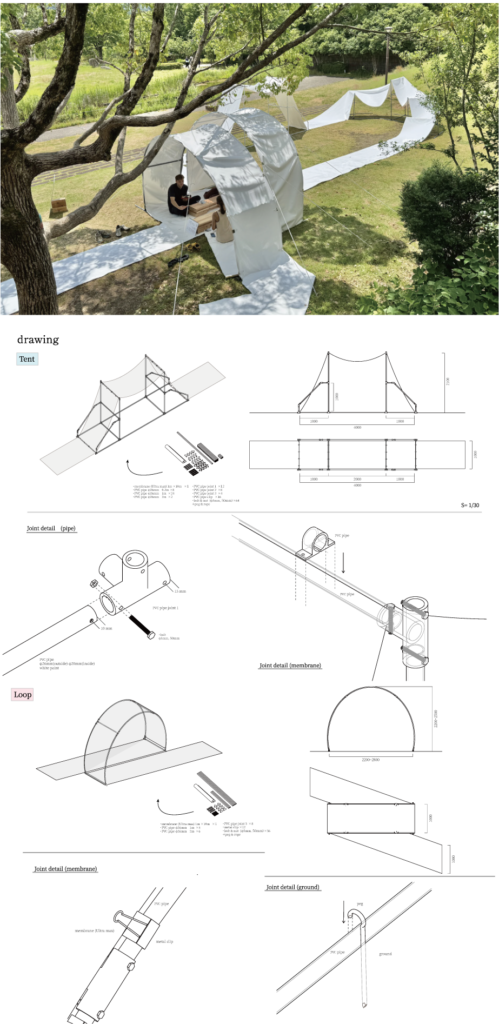 市販の塩ビパイプとジョイントを活用し、組み立てと解体を容易にしたフレームに、ロール状の膜をかけていき、ひとつながりの様々な場所を作るというアイデア。屋台状のものや、ループ状のものなどのユニットを公園内に自由に配置することで柔軟な使い方ができる。
