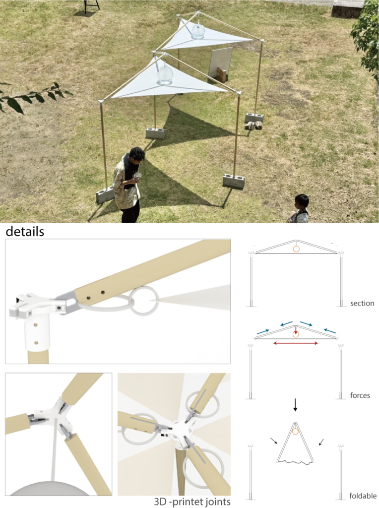公園内には、小さな倉庫しか置くことが出来ないため、仮設の日除けもその中に収納できるような設計が求められた。また今後住民自身が活用できるように、組み立てに関しても女性でも容易に持ち運びができ特別な工具なしに組み立てが可能であることが求められた。また、技術協力と膜材提供をしてくれた太陽工業からは、構造計画や材料選択についての助言をいただき、オンラインや大学でのミーティングを週一程度の頻度で重ねていった。安全性や、機能性の検討のため、実物大のスケールでモックアップを作成し、検討した。