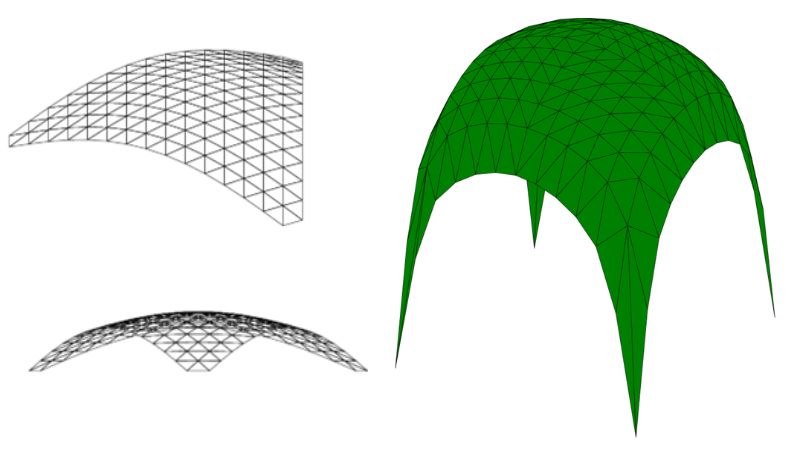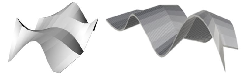 建築のいわゆる自由曲面シェルはベジエ曲面やNURBSなどのパラメトリック曲面でモデル化されるが,構造解析や施工の段階では離散的なメッシュやパネルが用いられる。したがって,最初から離散化された曲面(多面体)を対象とするのが望ましく、離散曲面の滑らかさの計量を用いた設計法が,Ohsaki and Hayakawa [7]によって提案されている。Rollingとroundnessの計量を最小化する形状を図3, 4に示す。一方で,1つの方向に直線の母線を持つ曲面も,魅力的かつ施工性に優れた曲面であり,線織面や可展面を用いた設計法[8, 9]が提案されている。それらの例を図5, 6に示す。